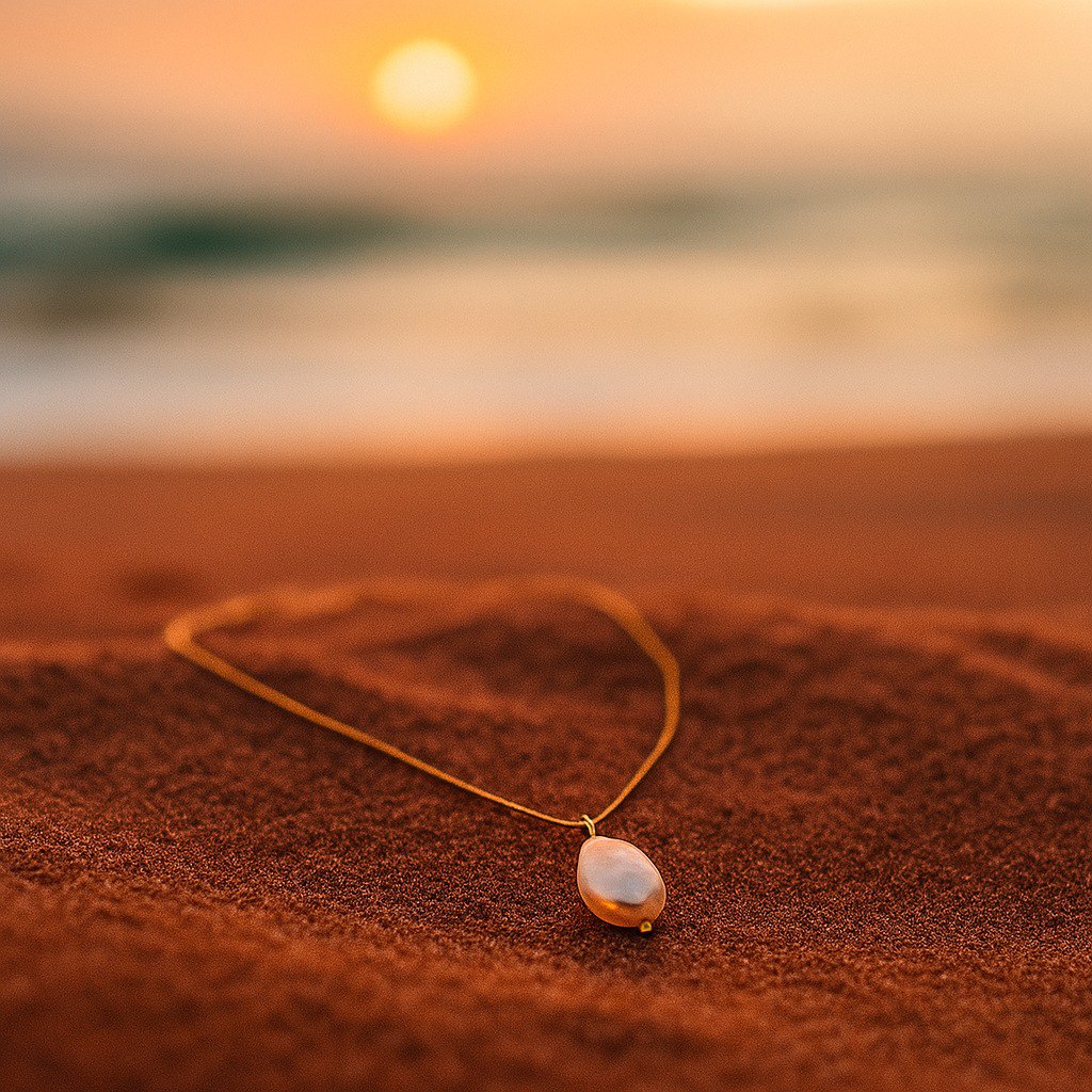 Naszyjnik Meredith jest hołdem dla pierwszego światła Sahary, które delikatnie oświetla nieskończone wydmy. Na subtelnym złotym brzegu unosi się starannie oszlifowana owalna perła, która odbija światło ukrytej oazy. Ten klejnot jest szeptem świtu: czysty, minimalistyczny i głęboko poetycki.