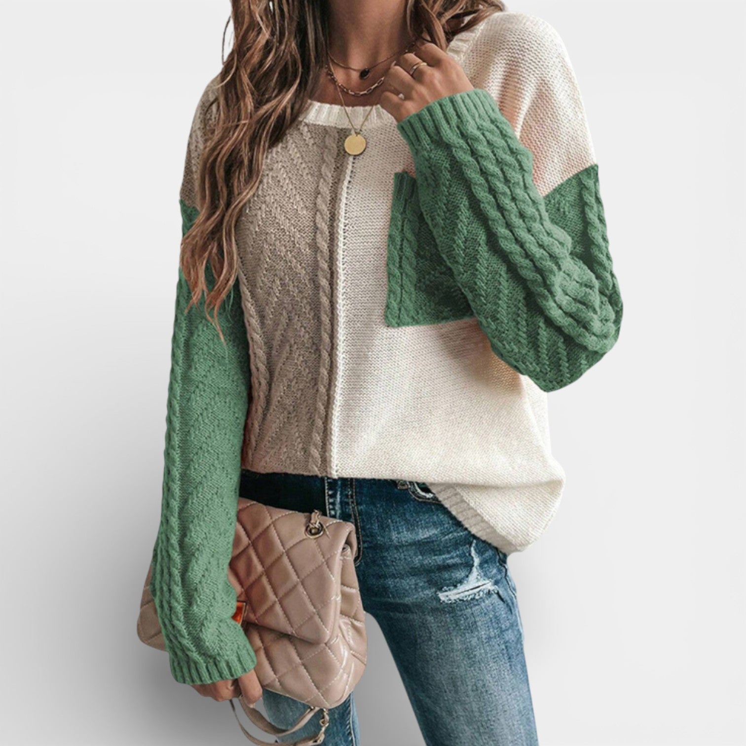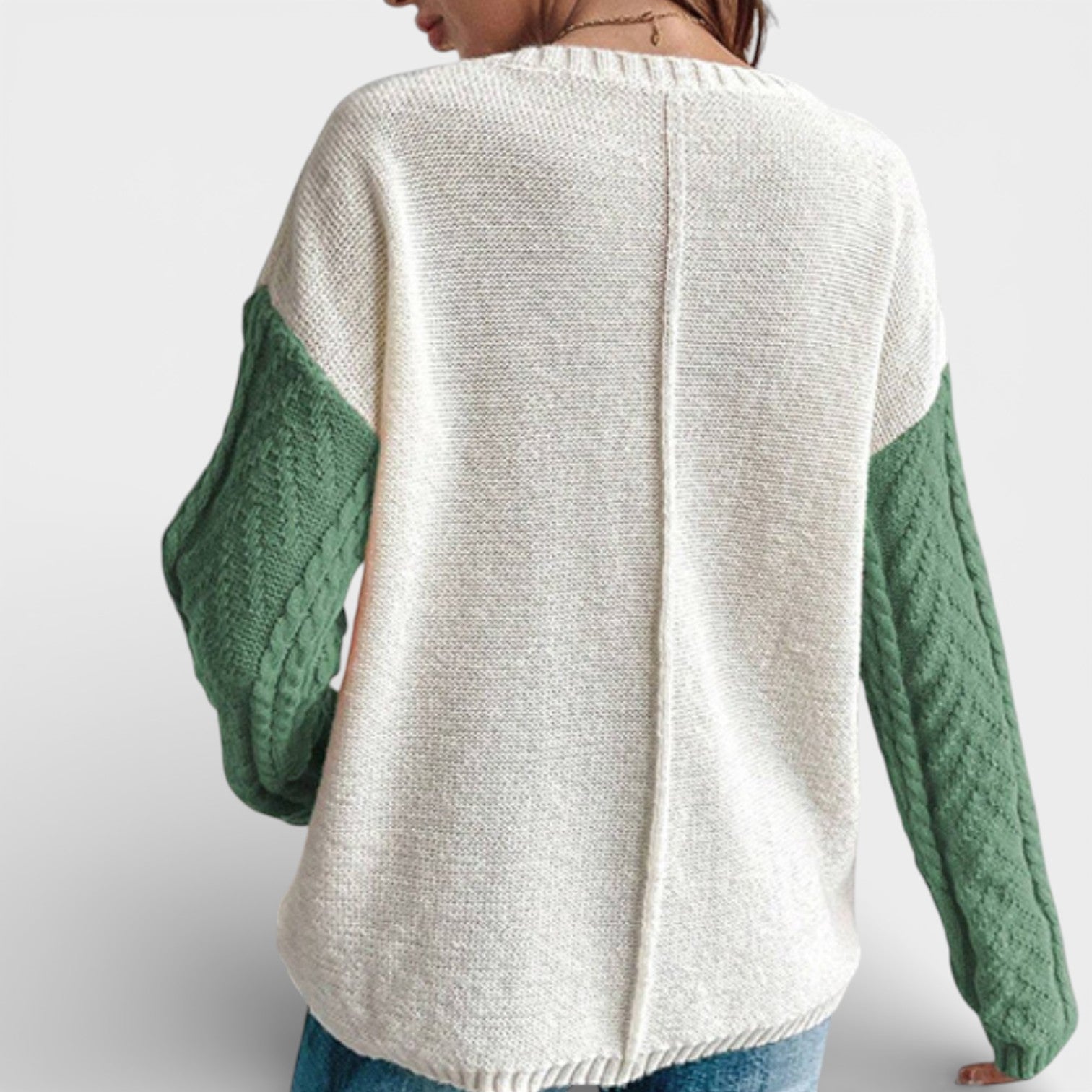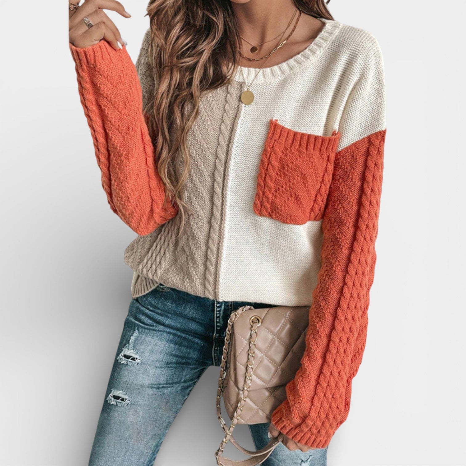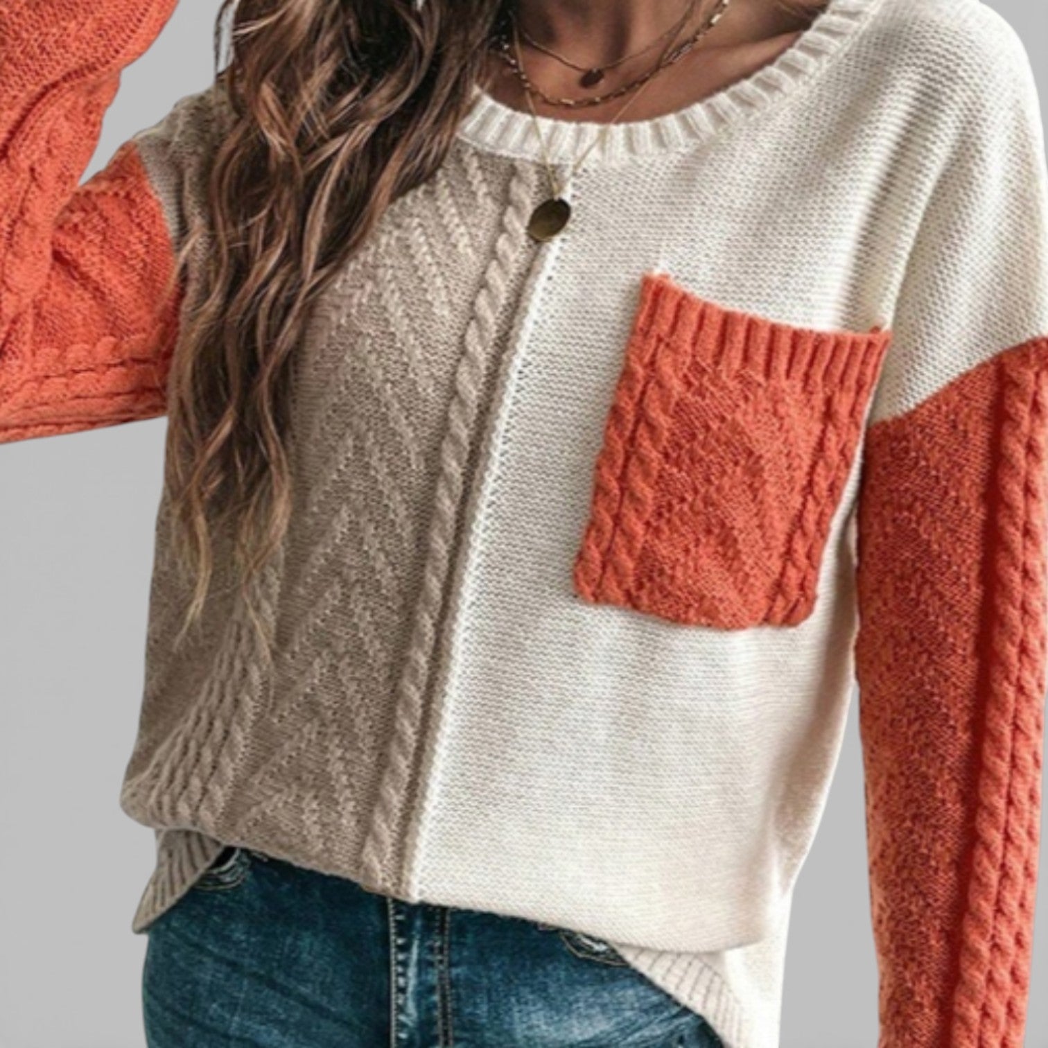 Ten damski dzianinowy sweter łączy gładniejszy korpus z wyraźnie strukturalnymi rękawami o warkoczowym splocie, tworząc ciekłą, a jednocześnie łatwą w noszeniu całość. Opuszczone ramiona i luźniejszy krój nadają swobodny charakter i zapewniają komfort przez cały dzień – niezależnie od tego, czy jesteś w mieście, w pracy czy w domu. Praktyczna kieszeń na piersi stanowi subtelny akcent i podkreśla casualowy styl swetra, który świetnie komponuje się z jeansami, legginsami i spódnicą.