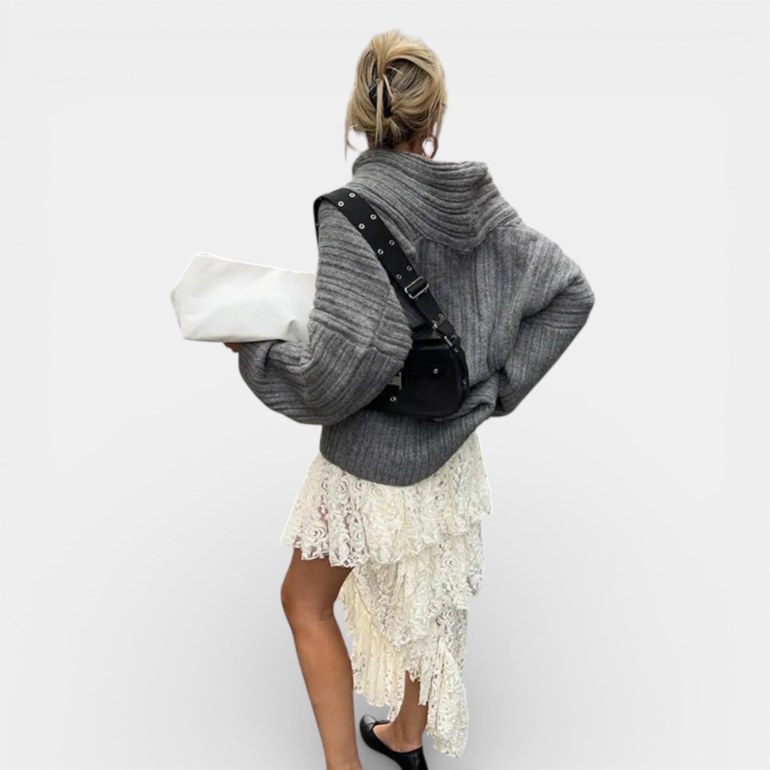 Nowoczesna forma i przytulna dzianina tworzą look, który wygląda stylowo bez wysiłku.