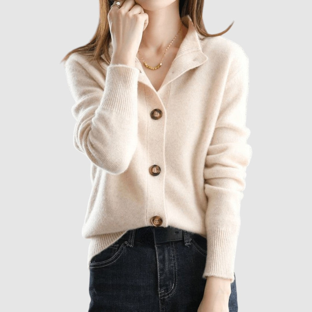 Viktorie to sweter, który łączy luksus kaszmiru z ponadczasowym designem. Jego delikatny materiał oferuje wyjątkowy komfort i ciepło, podczas gdy klasyczny krój z guzikami podkreśla kobiecą elegancję. Idealny na chłodne dni, kiedy chcesz czuć się przytulnie, a jednocześnie stylowo.