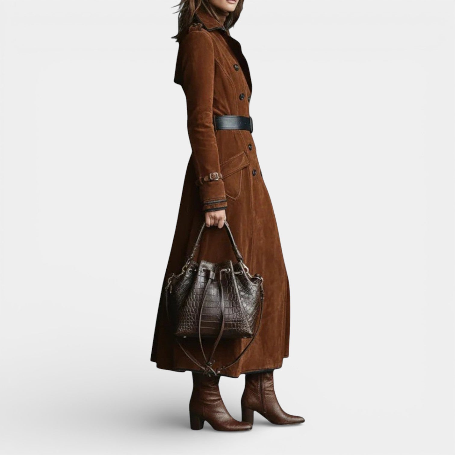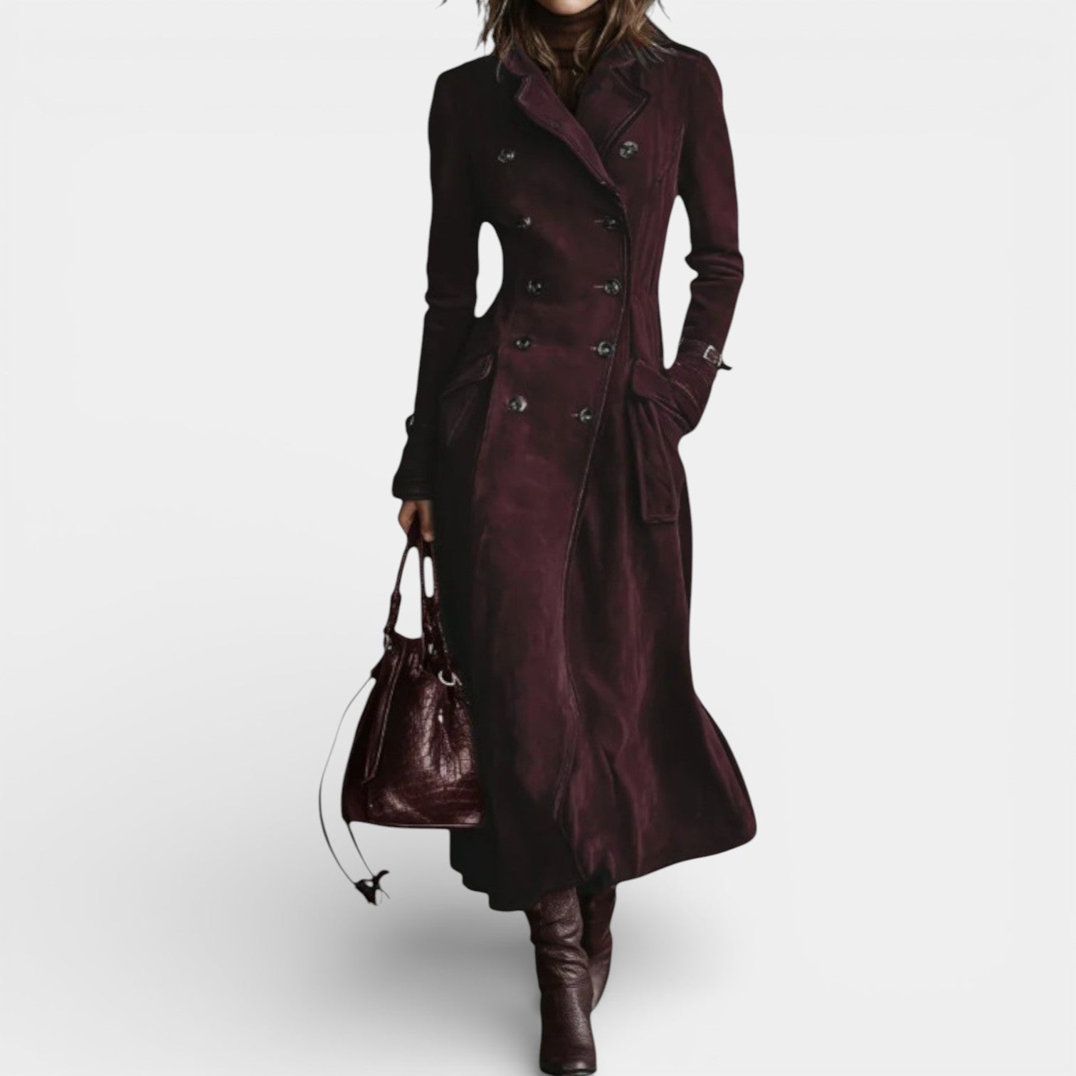Genowefa – Długi płaszcz dwurzędowy o rzeźbionej sylwetce