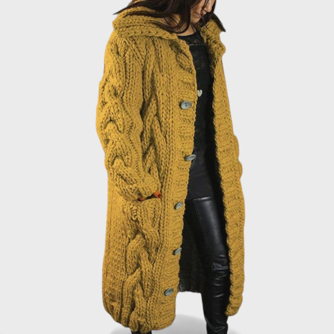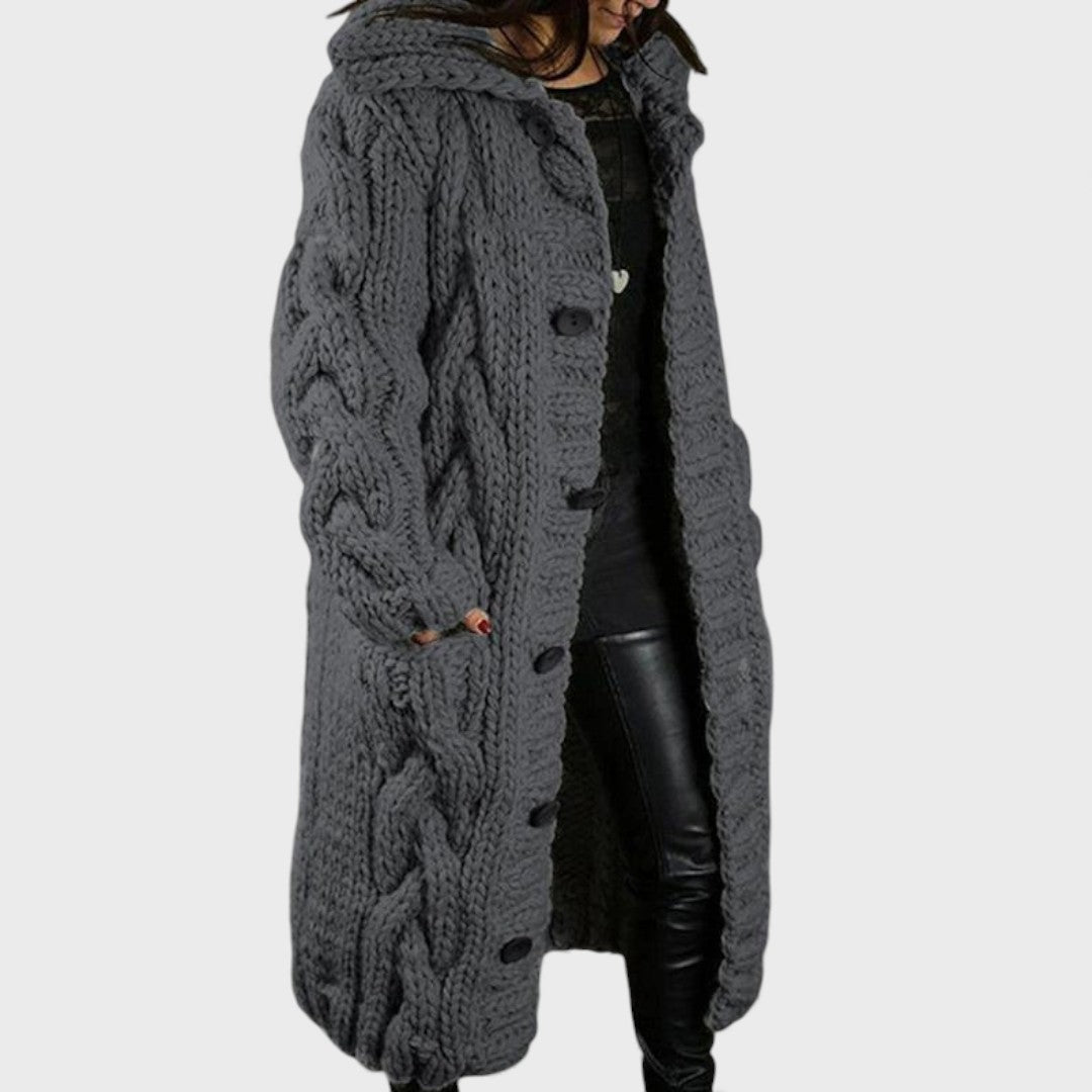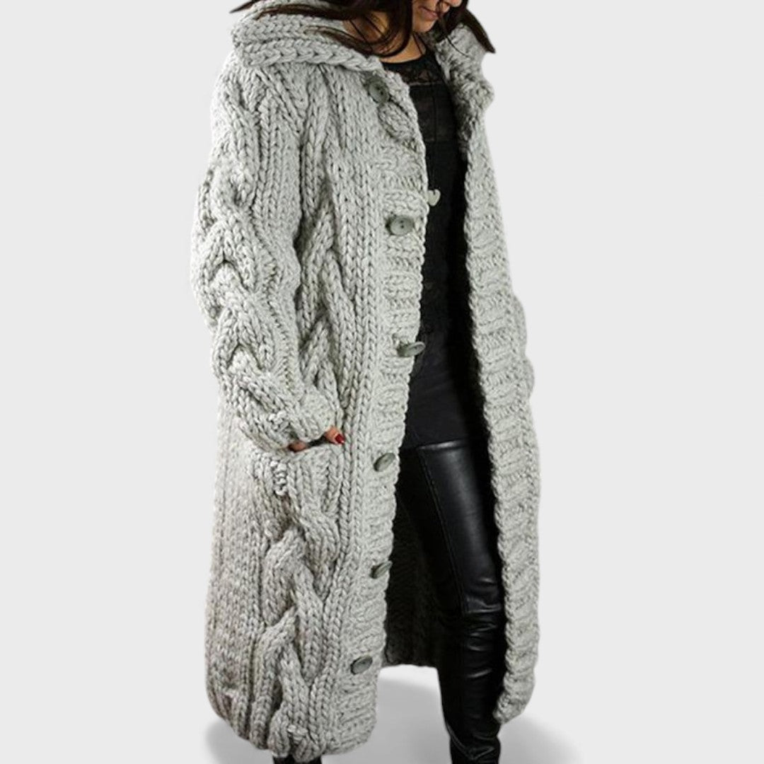 Elegancki i wygodny płaszcz Karina otula Cię ciepłem, fakturą i ponadczasowym stylem. Wykonany z miękkiej i oddychającej mieszanki dzianiny, ma oversize'owy design w warkocze, który dodaje zarówno komfortu, jak i charakteru. Silhouette o pełnej długości oferuje delikatne osłonięcie brzucha oraz elegancki drapowanie, podczas gdy kaptur i boczne kieszenie zapewniają praktyczną elegancję. Niezależnie od tego, czy wychodzisz na relaksujący spacer, czy spotykasz się z przyjaciółmi, Karina sprawia, że wyglądasz modnie, komfortowo i bez wysiłku elegancko.