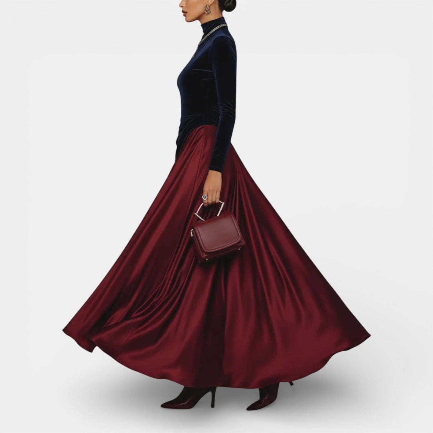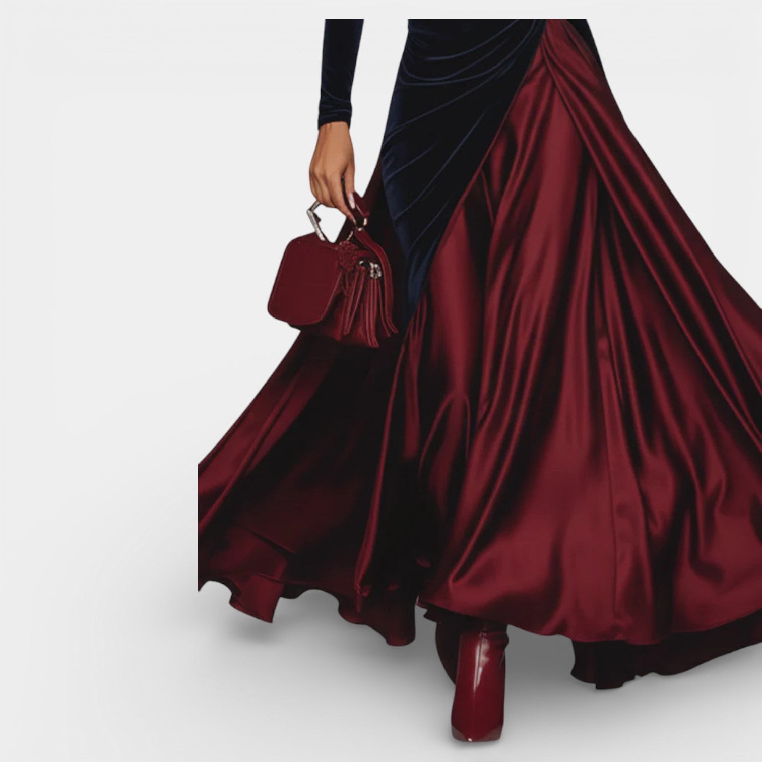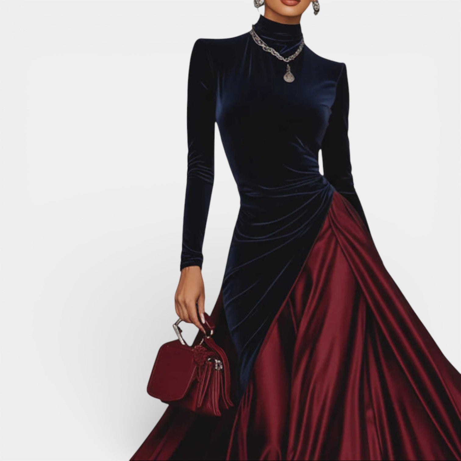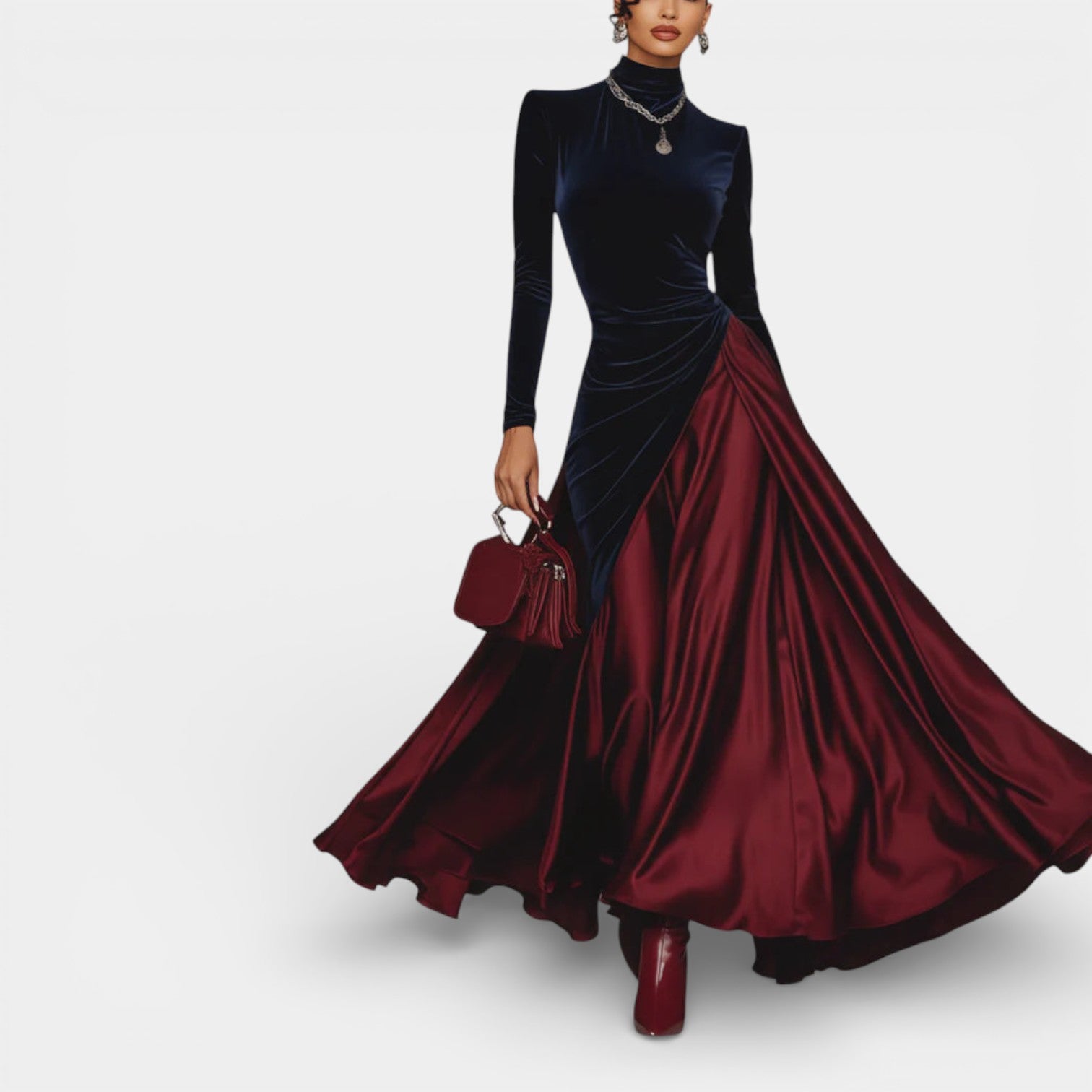 Ta długa sukienka wieczorowa łączy głębię granatowego aksamitu z jedwabistą płynnością bordowego satynu, tworząc wyrafinowany kontrast w stylu color block. Dopasowany tors podkreśla sylwetkę, a wysoki kołnierz i długie rękawy dodają klasy w nowoczesnym wydaniu. Szeroko opadająca spódnica pięknie pracuje w ruchu, dzięki czemu sukienka sprawdza się podczas formalnych kolacji, wyjątkowych uroczystości i wieczorów, kiedy chcesz wyglądać pewnie i elegancko.