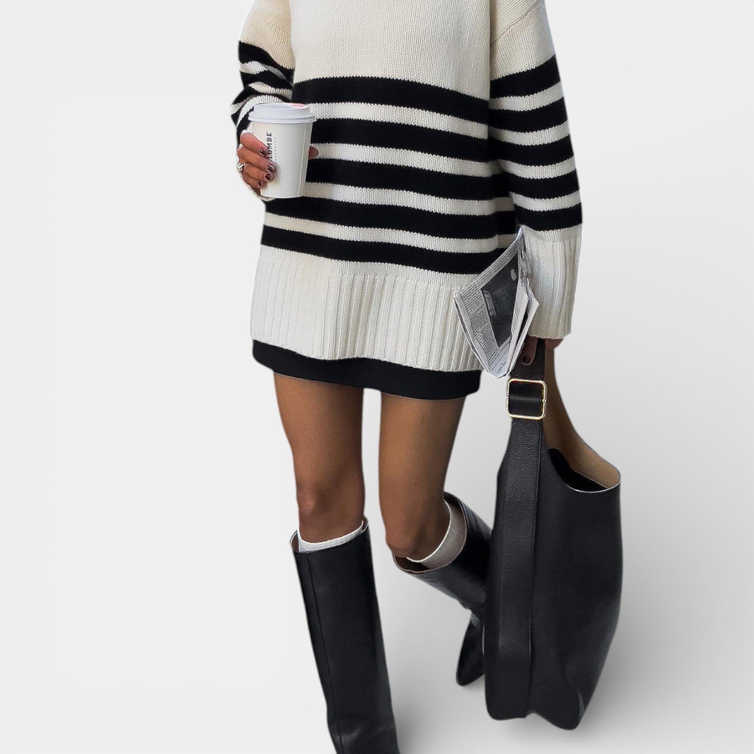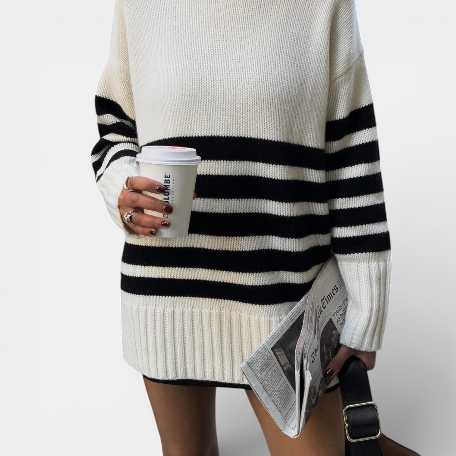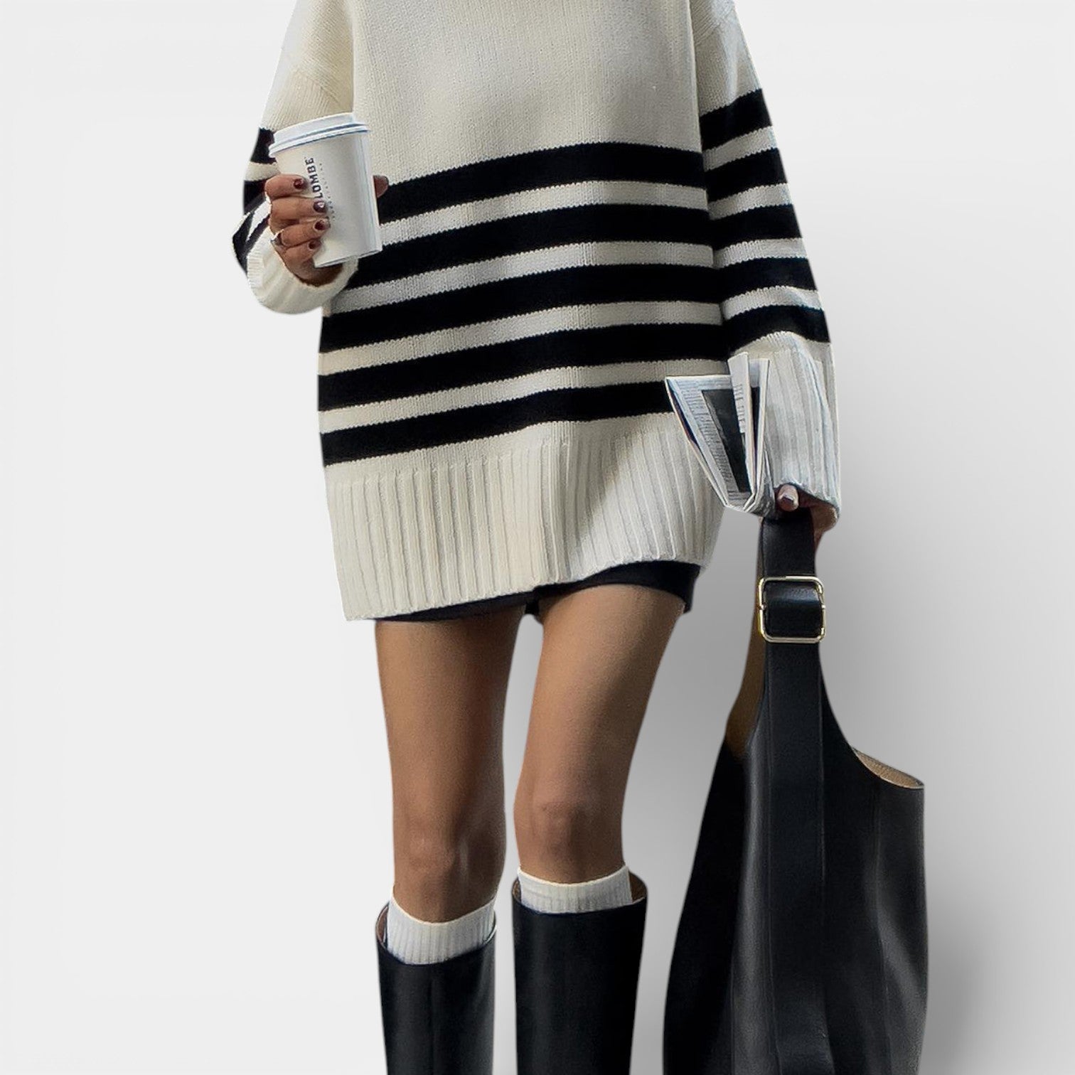 Sweter Marcelina łączy klasyczne paski z lekko podniesionym kołnierzem typu mock, tworząc elegancki i jednocześnie swobodny look. Miękka, przyjemna w dotyku dzianina zapewnia komfort noszenia i przyjemne ciepło w chłodne dni. Luźny fason sprawia, że sweter łatwo dopasowuje się do różnych stylizacji – od dżinsów, przez spodnie materiałowe, po spódnice. Doskonały na co dzień, do pracy lub na spotkania w czasie wolnym, Marcelina jest wszechstronnym wyborem dla kobiet ceniących styl i wygodę.