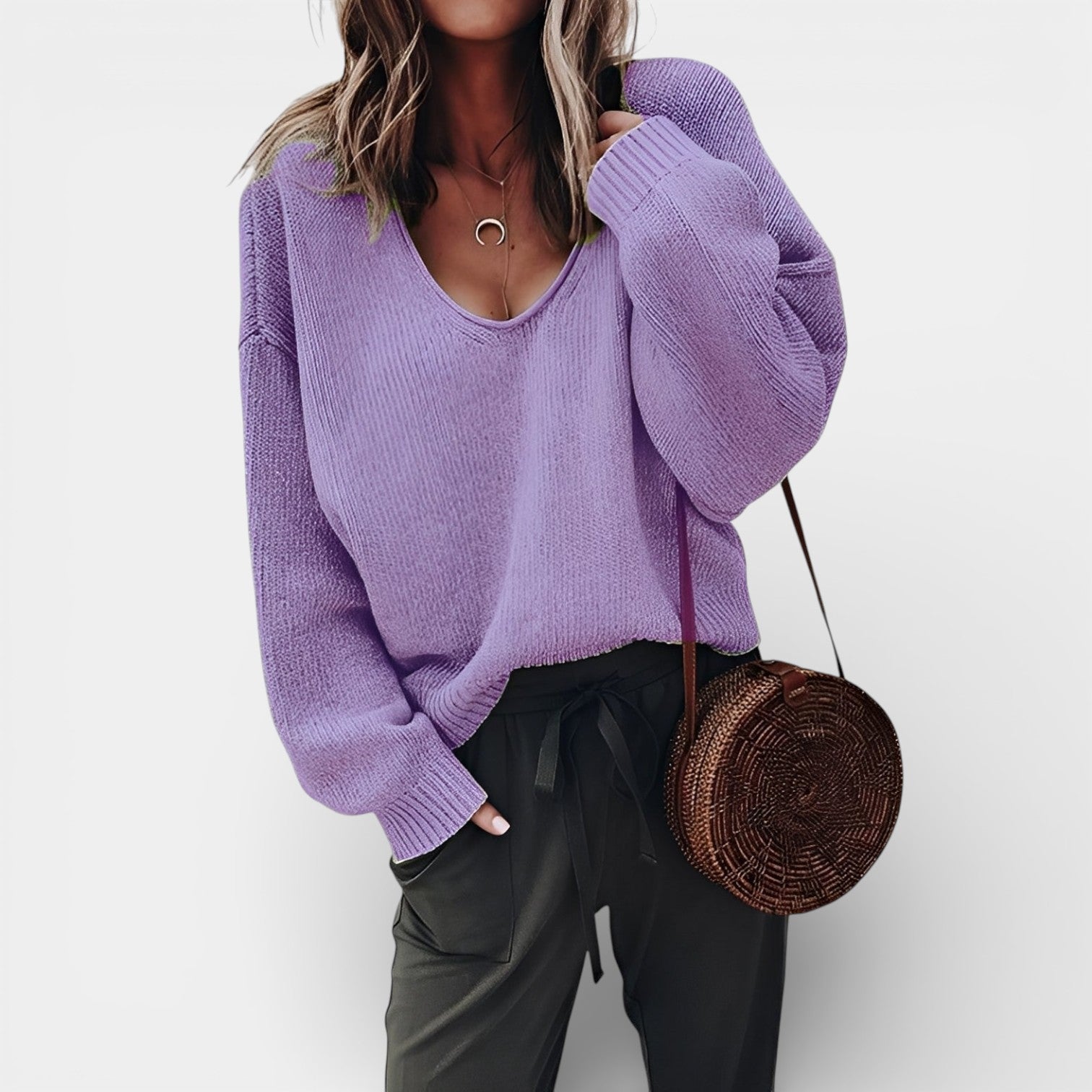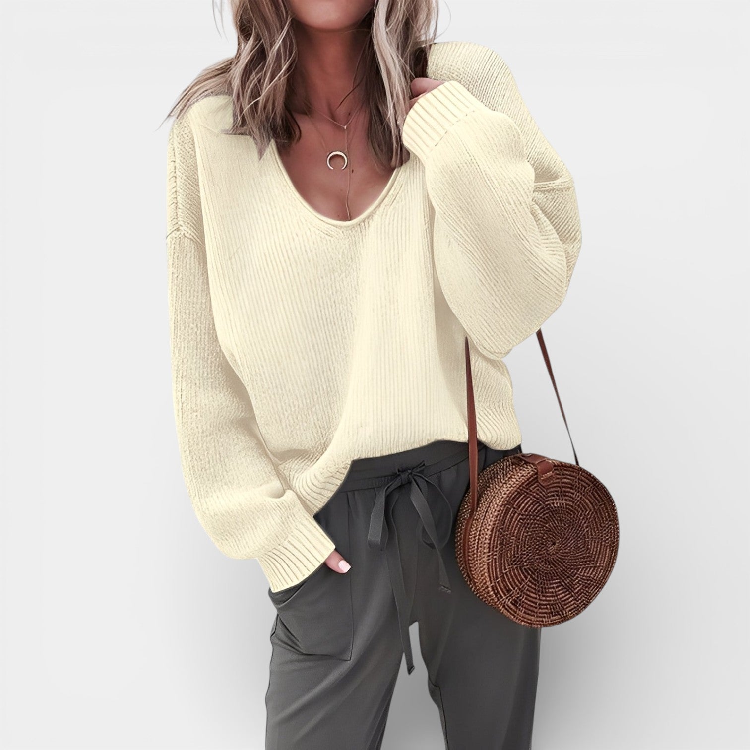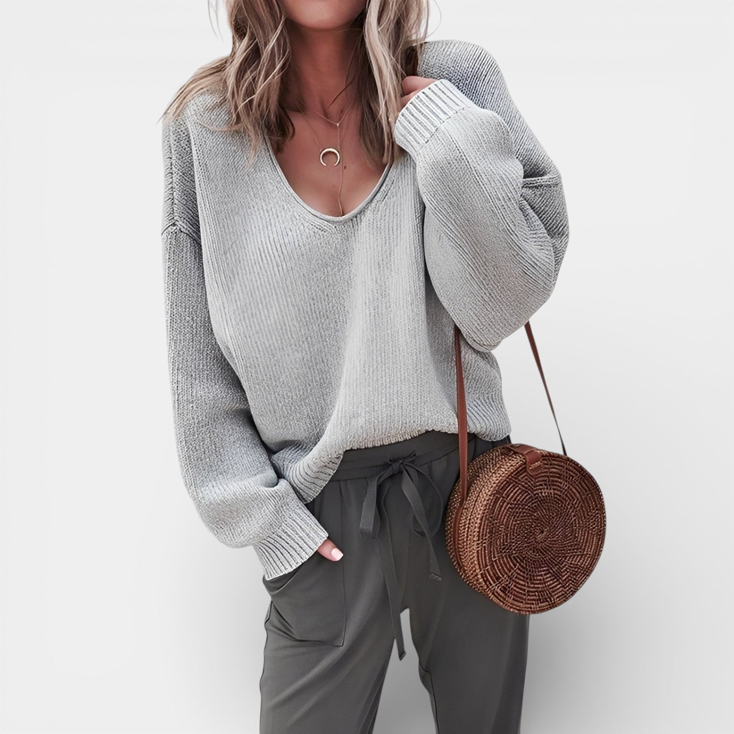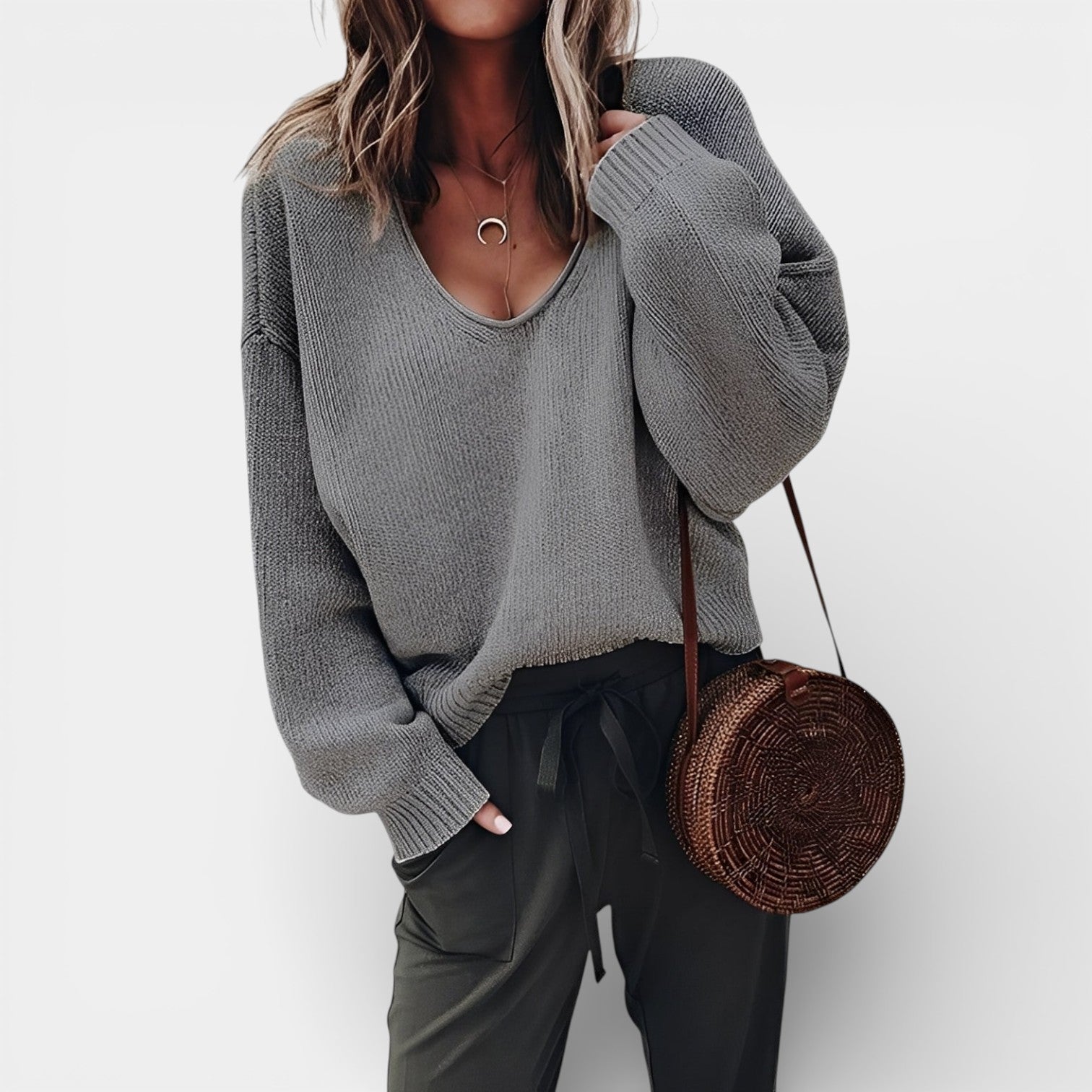 Ten dzianinowy sweter z dekoltem w serek został zaprojektowany tak, aby łączyć swobodę z dopracowanym wyglądem. Luźny krój miękko układa się na sylwetce, a subtelna faktura dzianiny dodaje mu elegancji bez przesady. Dekolt V pięknie wydłuża szyję i sprawia, że sweter świetnie wygląda zarówno samodzielnie, jak i w warstwowych stylizacjach. Idealny do jeansów, spódnic i legginsów — sprawdzi się w domu, w pracy zdalnej i podczas codziennych wyjść.