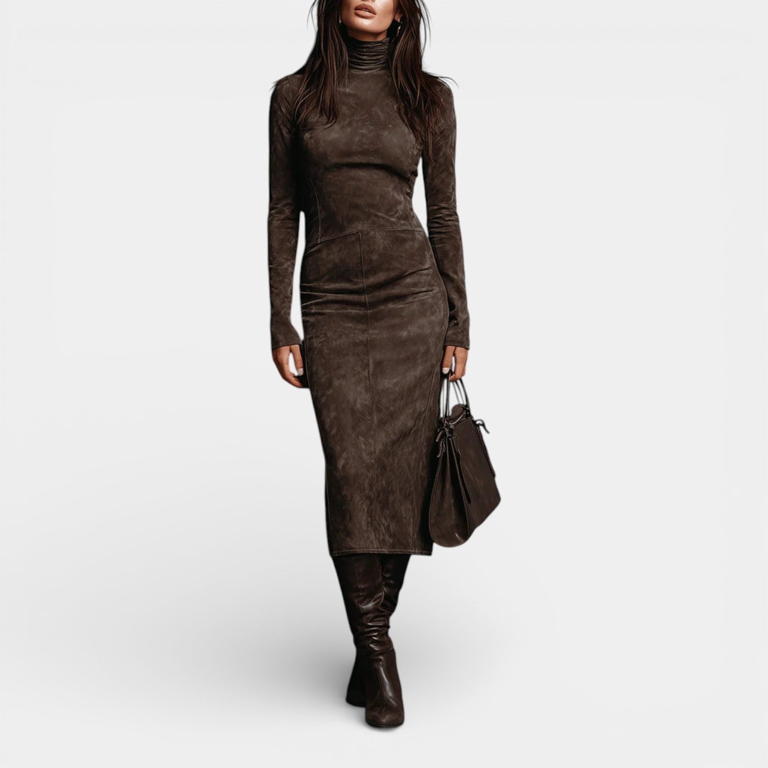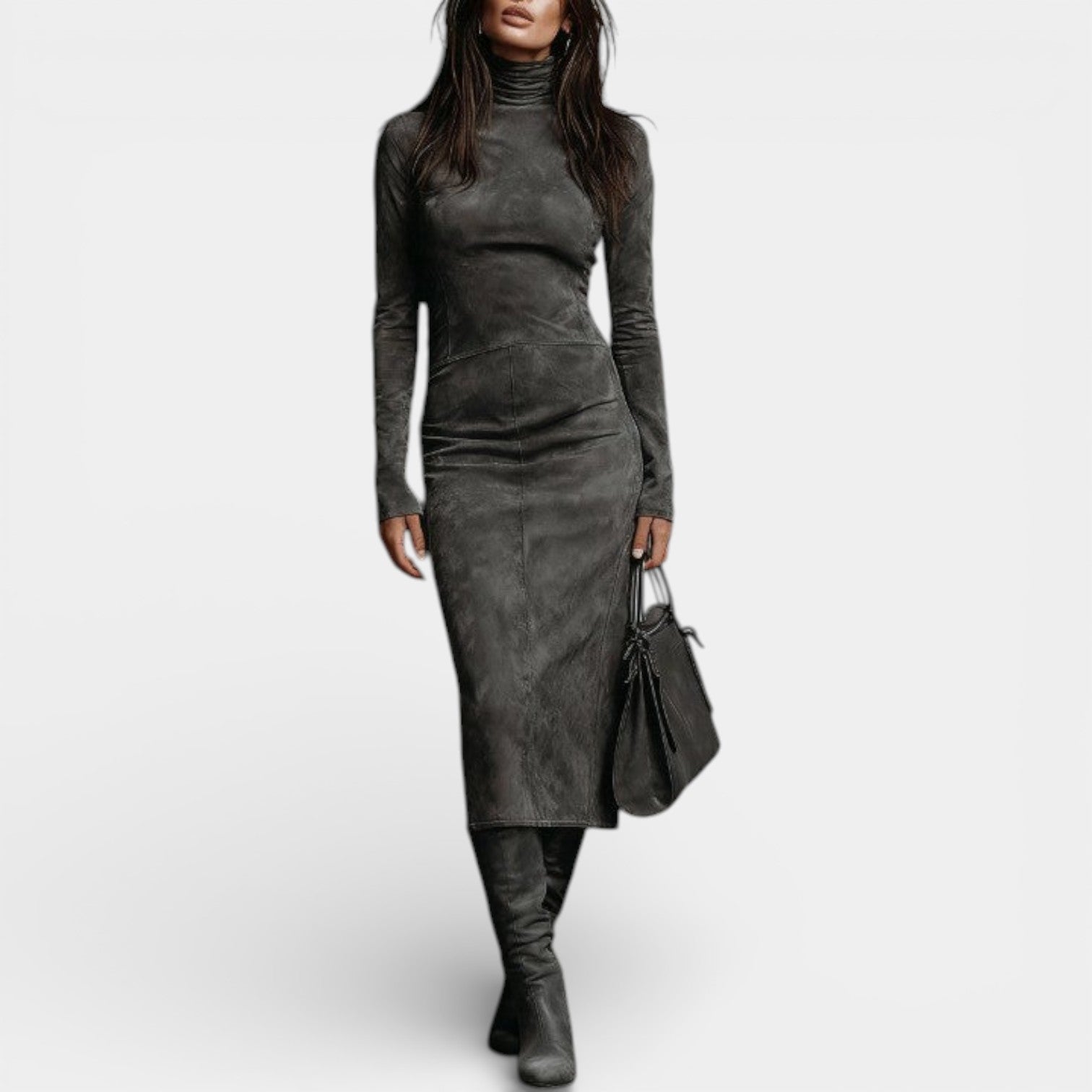 Renata to dopasowana sukienka midi z wysokim golfem i długimi rękawami, stworzona z myślą o wygodzie oraz ponadczasowym wyglądzie. Prosta linia podkreśla sylwetkę w naturalny sposób, a gładko układający się fason sprawia, że model dobrze prezentuje się zarówno w minimalistycznych zestawieniach, jak i z bardziej wyrazistymi dodatkami. To sukienka, po którą sięgasz wtedy, gdy chcesz wyglądać dopracowanie przez cały dzień, bez rezygnowania z komfortu.