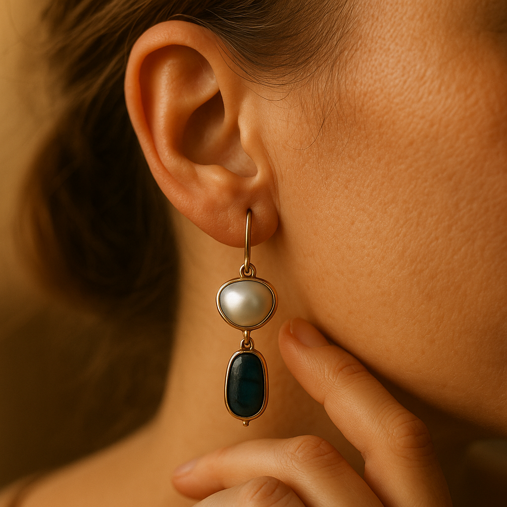 Głęboki niebieski kamień przypomina morze o zachodzie słońca, podczas gdy naturalna perła dodaje delikatnego, księżycowego blasku. Ta kombinacja evokuje grację minionych czasów i nadaje twojemu wyglądowi autentyczny akcent.