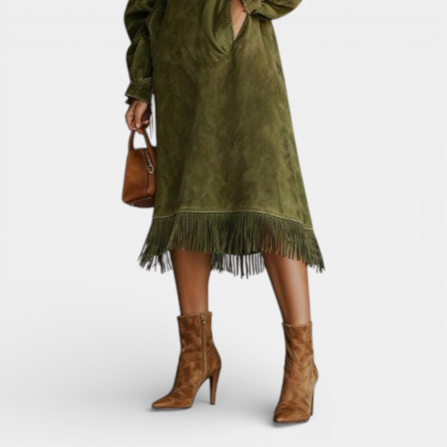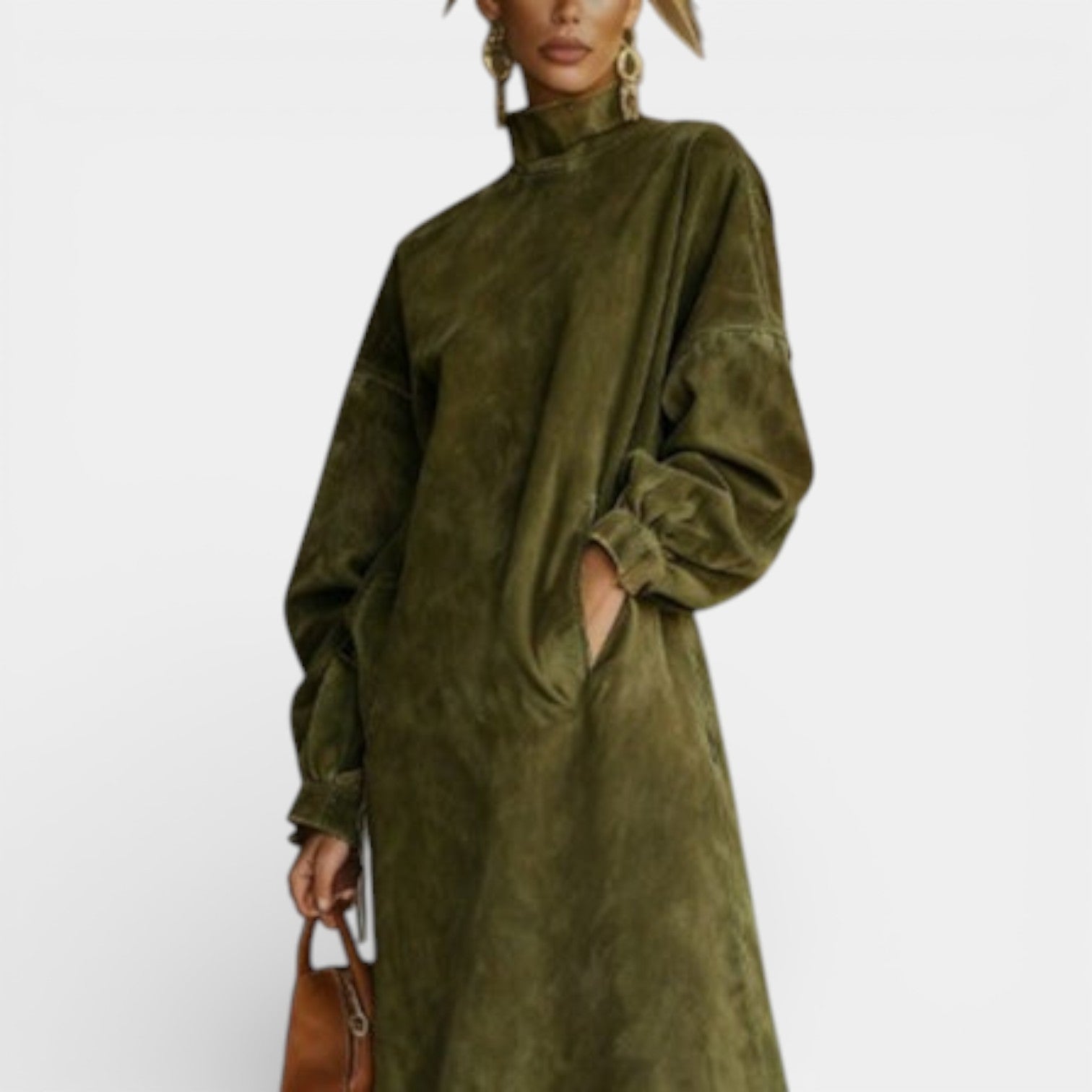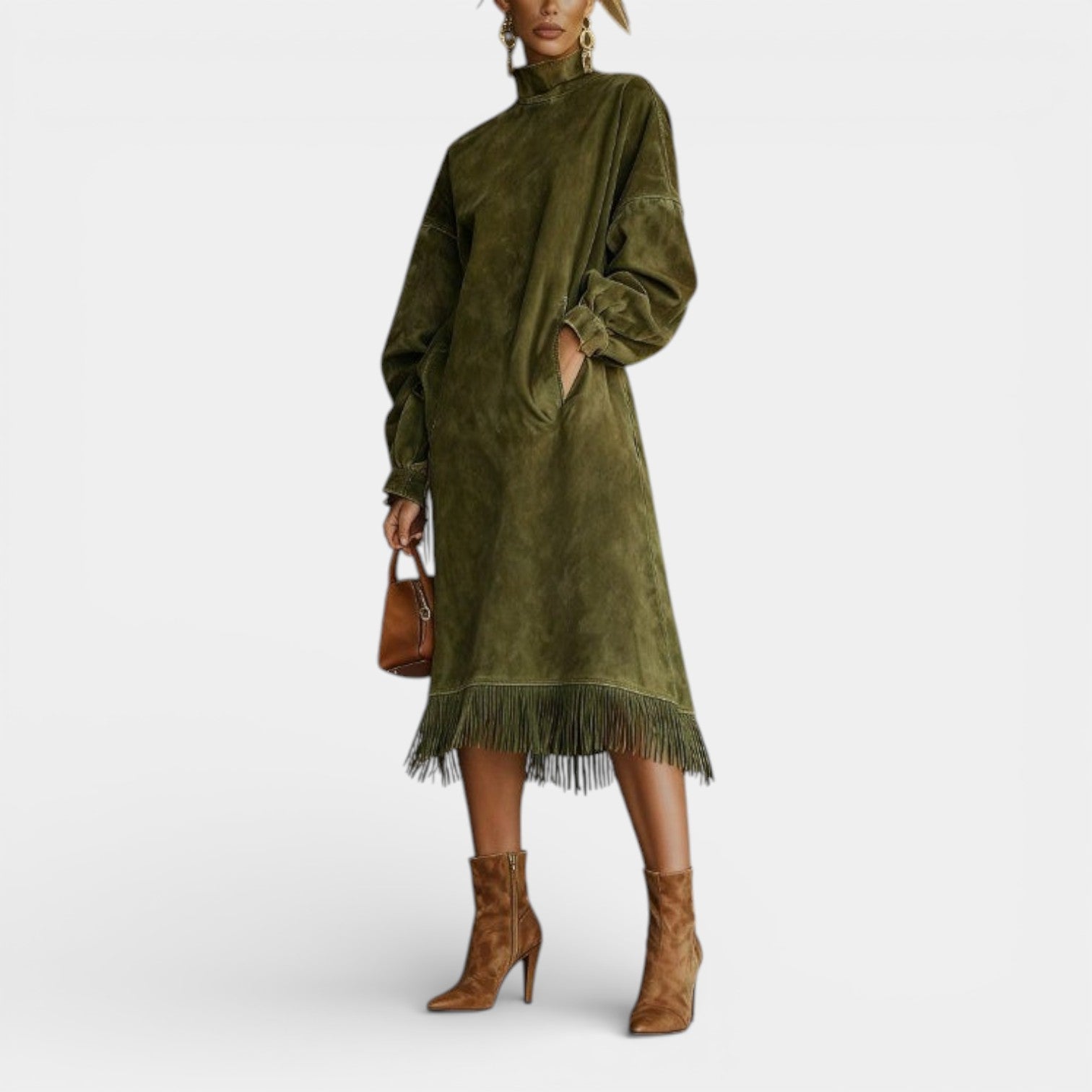 Gabriela to sukienka midi o swobodnym, komfortowym kroju, wykończona golfem, który subtelnie podkreśla linię szyi i dodaje całości klasy. Materiał o fakturze inspirowanej suede nadaje modelowi miękki, szlachetny wygląd, a dekoracyjne frędzle przy dole wprowadzają lekki ruch i artystyczny akcent bez zaburzania minimalistycznej formy. To propozycja, która sprawdzi się na co dzień z botkami, a także wtedy, gdy chcesz wyglądać bardziej dopracowanie przy zachowaniu pełnej swobody.