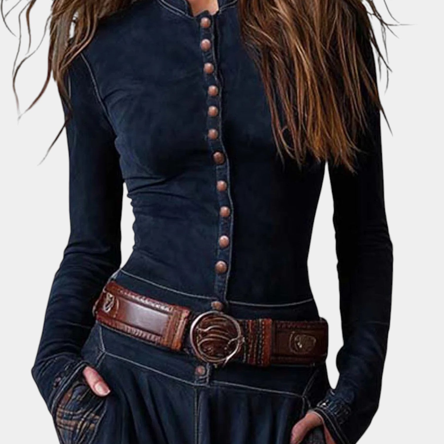 Helena łączy urok retro estetyki z delikatnym komfortem i wyraźnym nowoczesnym akcentem. Górna część z miękkiego eko-zamszu pięknie opina sylwetkę, metalowe guziki i klasyczny kołnierzyk nadają wyrafinowaną strukturę. Długa, płynna dolna część z artystycznym kraciastym panelem tworzy lekką, kobiecą sylwetkę, która wyróżnia się przy każdym kroku.