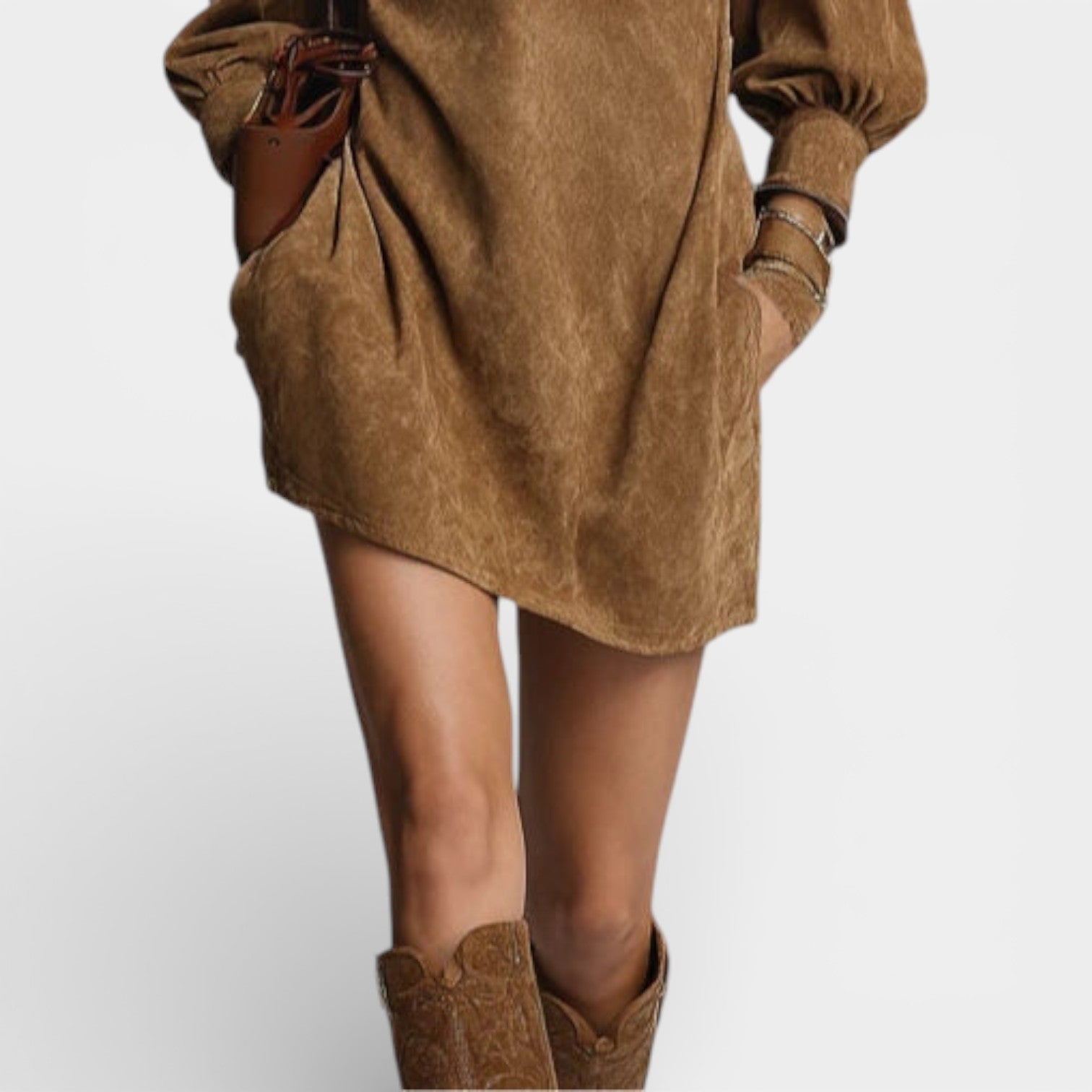 Hanna to krótka sukienka o prostym, świadomym kroju, wykończona golfem oraz dekoltem na suwak, który pozwala subtelnie regulować głębokość wycięcia. Bufiaste długie rękawy dodają lekkości i równoważą minimalistyczną formę, a jednolita linia sprawia, że model łatwo dopasować do codziennych i bardziej eleganckich zestawień. To propozycja, która świetnie współgra z kozakami lub botkami, tworząc dopracowany look bez nadmiaru.