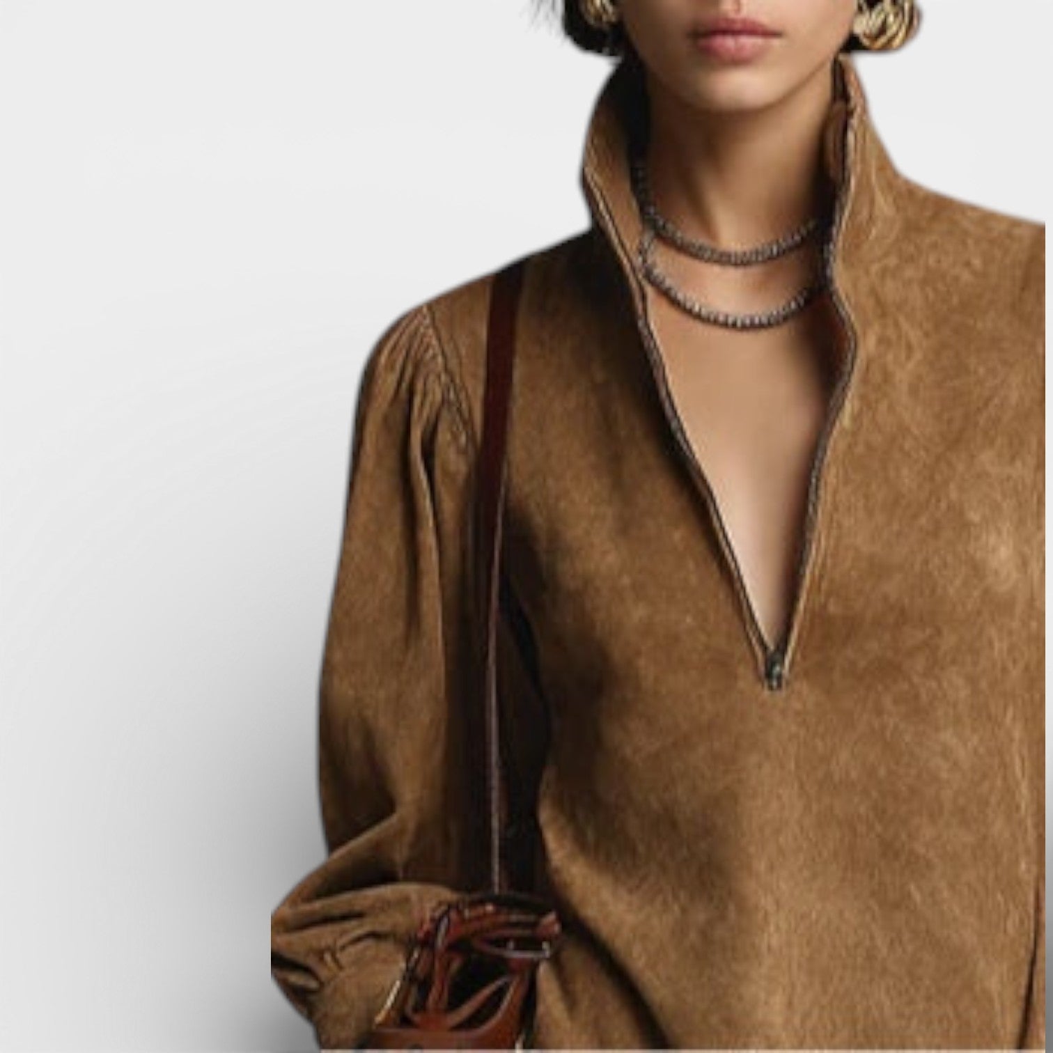 - Długie, lekko bufiaste rękawy dodające formie charakteru